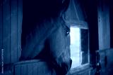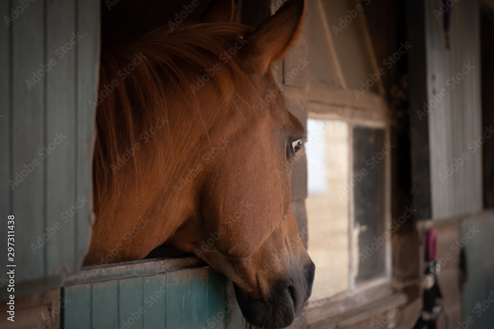 Subdued image of a Arab Stallion horse seen looking outside his stable towards an out of view groom. The horse is one of a private collection of horses