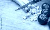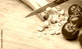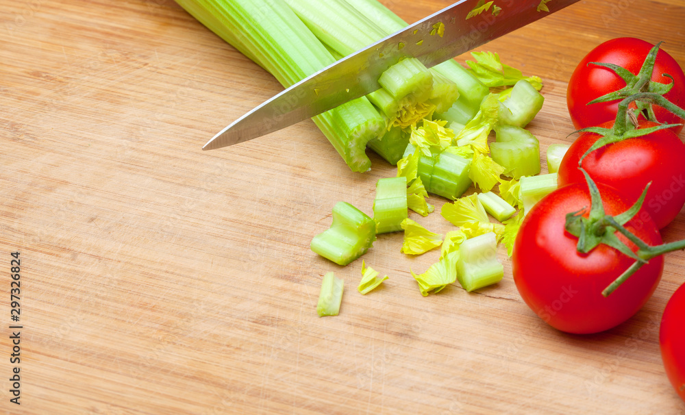 Celery and tomatoes on a cutting board