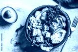Buddha bowl with quinoa, tofu, avocado, sweet potato, brussels sprouts and tahini dressing, top view. Healthy vegan food concept.