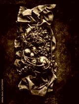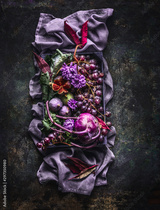 Beautiful purple fruit, vegetables and flowers composing on purple color tablecloth on dark background.Top view. Flat lay
