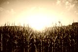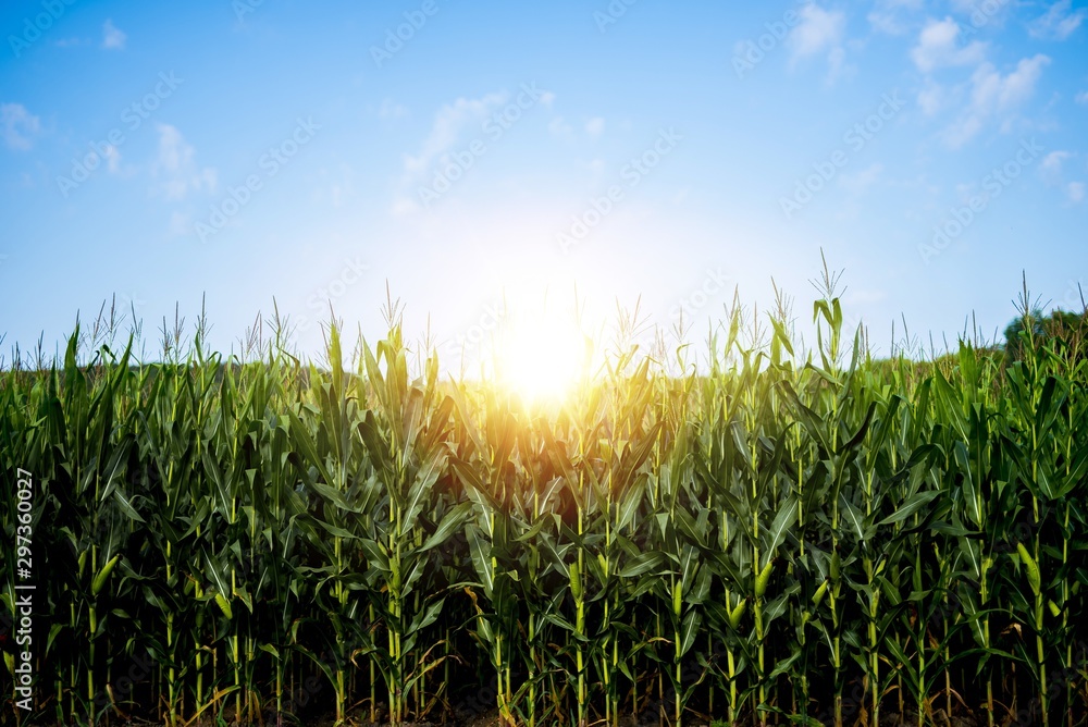 Beautiful shot of a cornfield with the sun shining in a blue sky