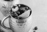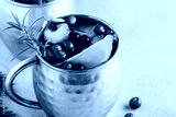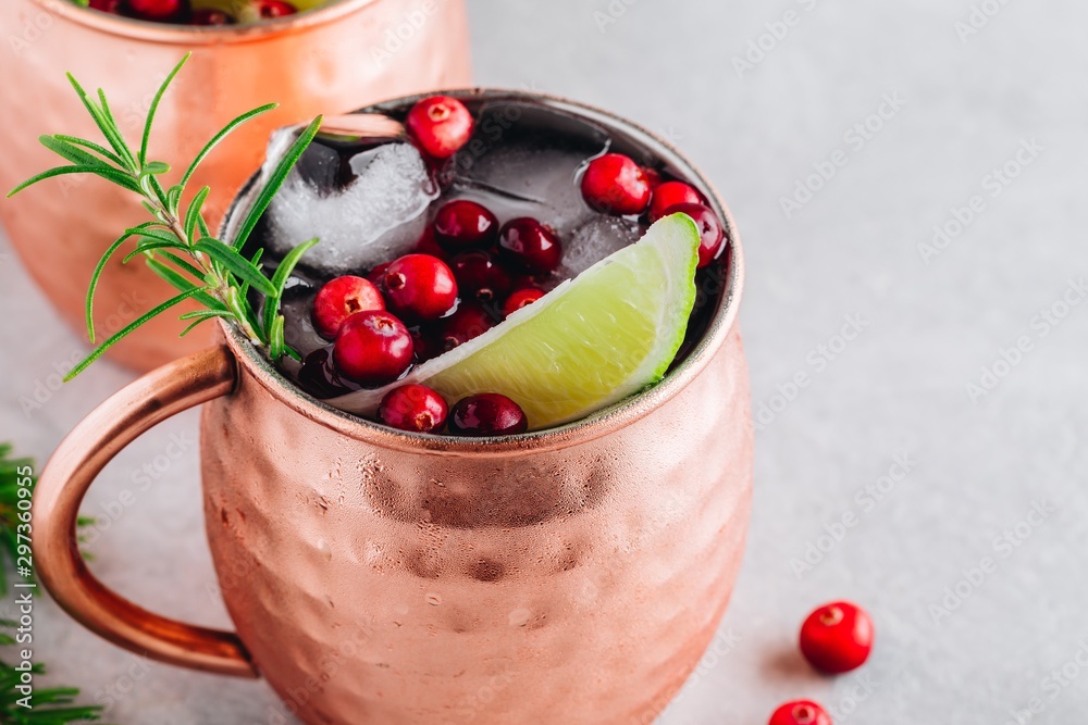 Holiday Moscow Mule ice cold Cocktail in copper cup with cranberries, lime and rosemary on stone background.