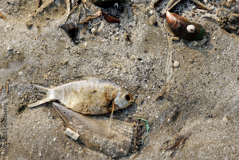 Dead fish on the sand beach