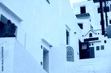 White stairs in romantic backstreet alley lane alleyway street with traditional typical Greek white buildings and colorful blue white buildings and balconies on Sifnos in Greece