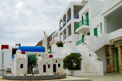 White stairs in romantic backstreet alley lane alleyway street with traditional typical Greek white buildings and colorful blue white buildings and balconies on Sifnos in Greece