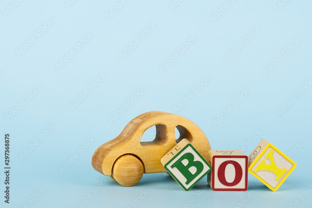 Blue background with colored cubes with letters Boy and wooden toy car, giving birth to a baby boy, toys for toddlers