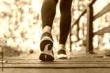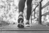 Woman runner feet walking in nature. Close up on shoes. Healthy lifestyle fitness concept.