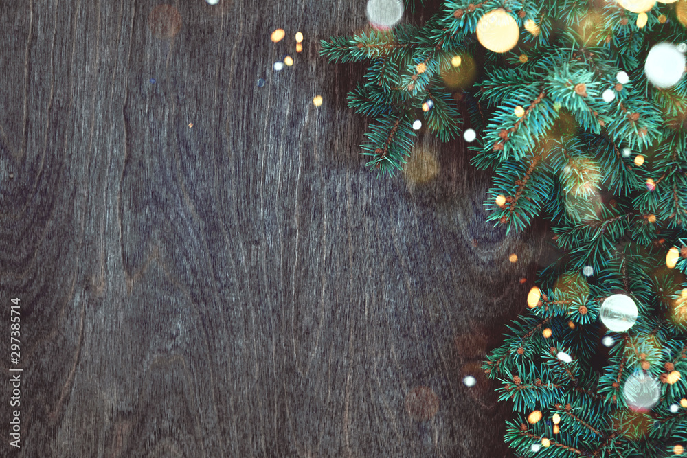 Natural Christmas background with border of fluffy green fir branches on a textured dark brown wood background with Christmas lights. Copy space for text, flat lay, top view.