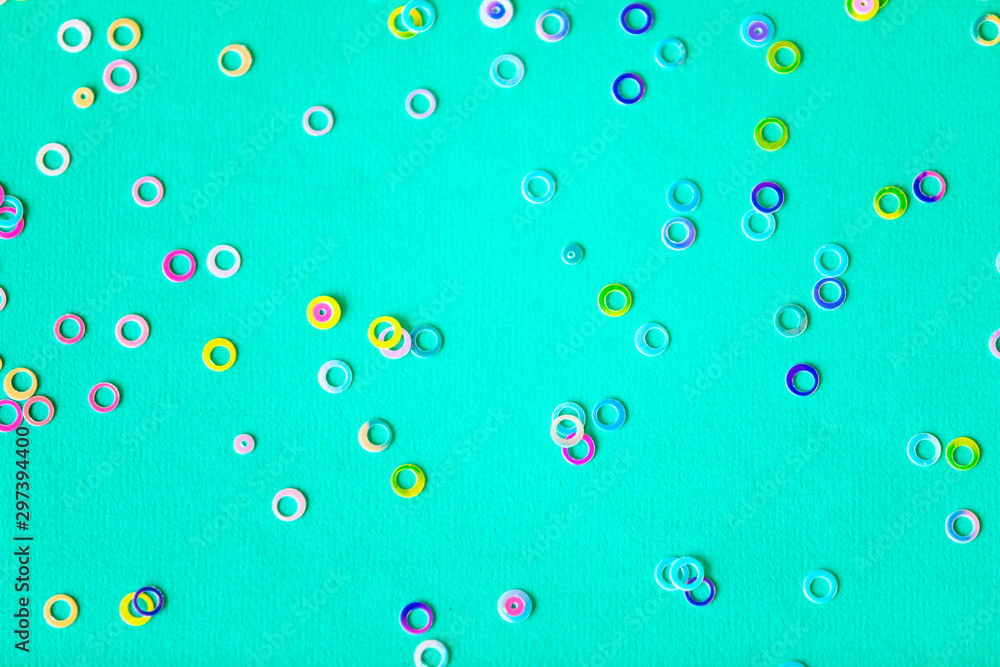 Colorful foil confetti background. Pastel colored pink, blue and yellow circles sparse on trendy mint green colored paper. Simple holiday concept. Top view, flat lay