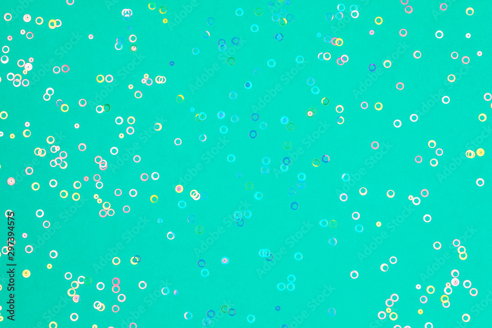 Colorful holographic foil confetti background. Pastel colored pink, blue and yellow circles sparse on trendy mint green colored paper. Simple holiday concept. Top view, flat lay