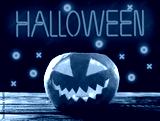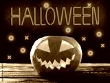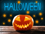 Jack-o-lantern pumpkin with burning candle and neon sign Halloween.