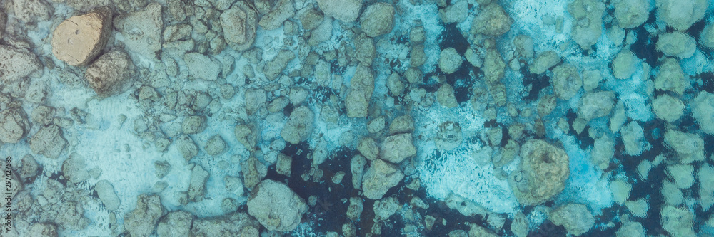 An aerial view of the beautiful Mediterranean sea, where you can se the rocky textured underwater corals and the clean turquoise water of blue lagoon Agia Napa