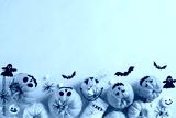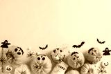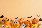 Top view of Halloween crafts, orange pumpkin, white ghost, bat and spider on orange background with copy space for text. halloween concept.