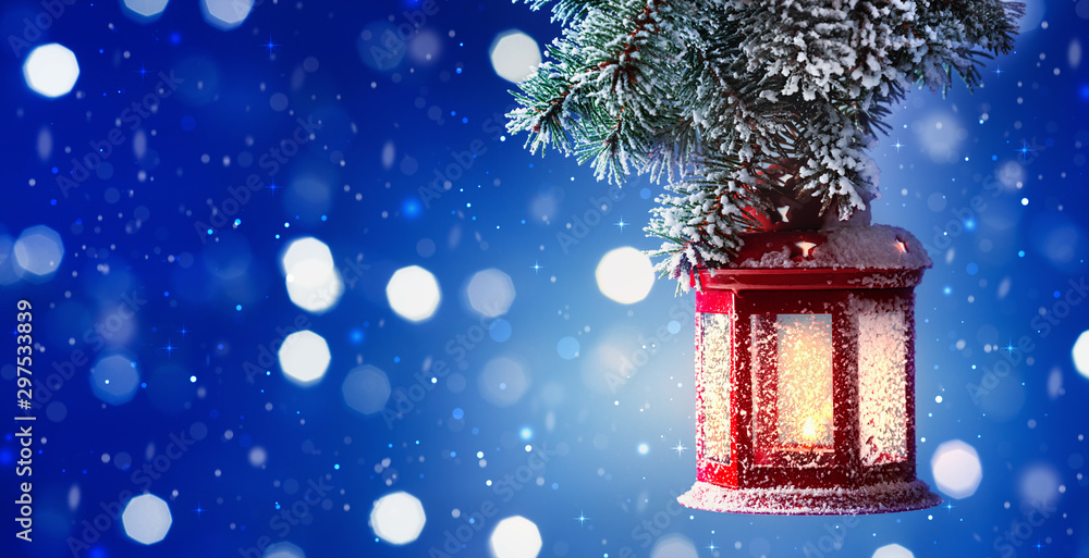 Christmas lantern hanging on snow covered fir branches. Winter cozy scene. Banner format.