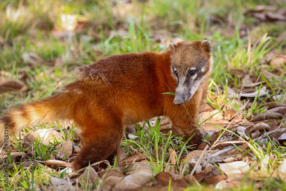 Close up of a Coati in natural habitat, light and shadow, Pantanal Wetlands, Mato Grosso, Brazil