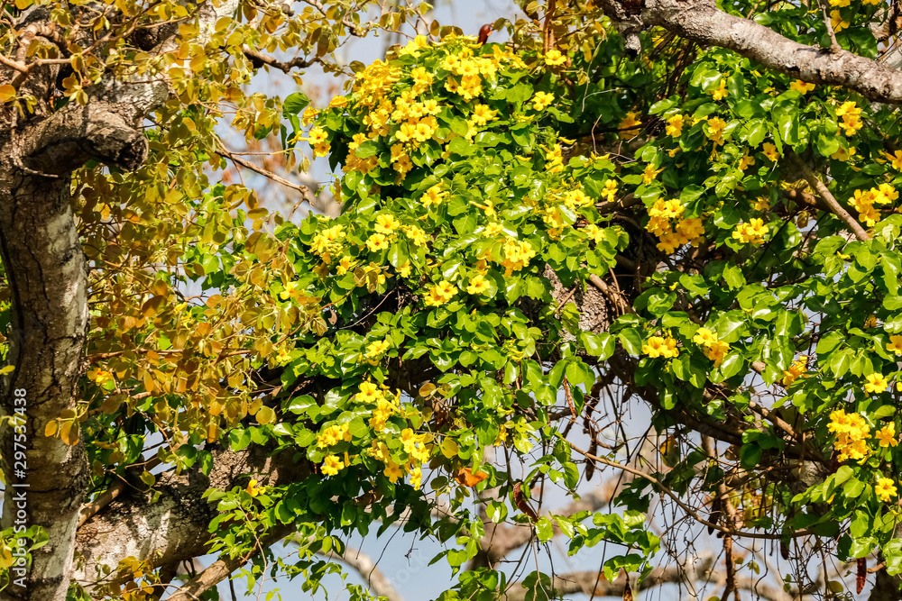 Close up of a wonderful yellow flowering tree in the sun, Pantanal Wetlands, Mato Grosso, Brazil