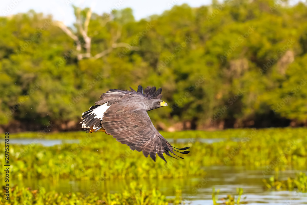 Great Black Hawk in flight with spread wings over a river covered with water plants, forest background, Pantanal Wetlands, Mato Grosso, Brazil