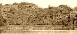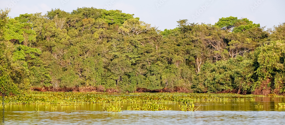 View to river edge with water plants and forest in late afternoon mood, Pantanal Wetlands, Mato Grosso, Brazil