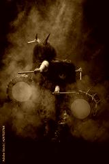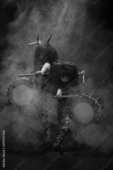 Two taiko drummers in a wig and a demon mask on stage with drumsticks and drums on a black background with smoke in light rays. Demons from Japanese mythology.