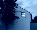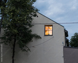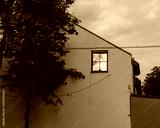 One window glows on the wall of an old house in the evening. The concept of loneliness.