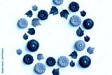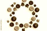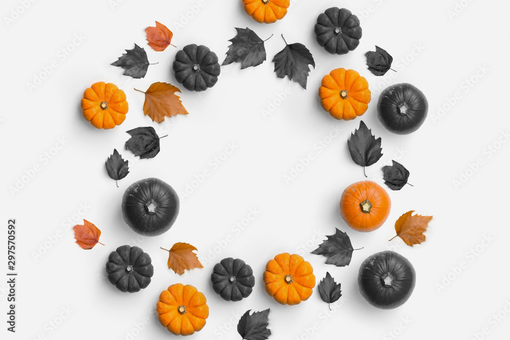 Autumn fall contemporary background composition with pumpkins and leaves in a circle shape.