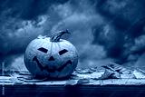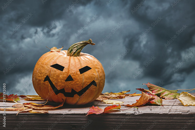 October pumpkin with painted face, dry leaves against gloomy evening sky. Old wood background. Happy Halloween.
