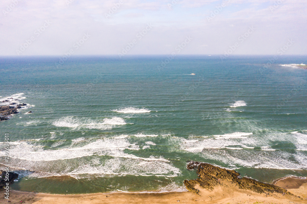 Aerial view of sandy beach with tourists swimming in beautiful clear sea water