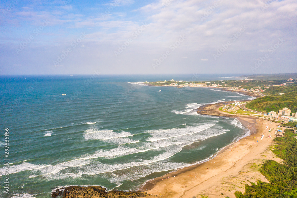 Aerial view of sandy beach with tourists swimming in beautiful clear sea water