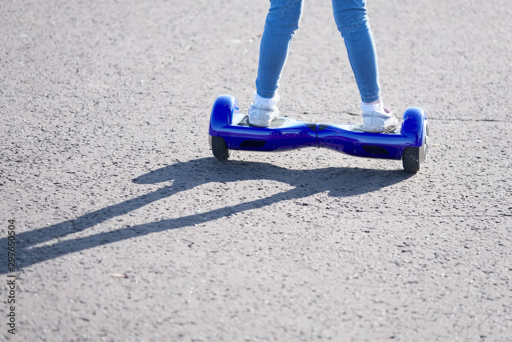 Girl riding blue electric battery powered hoverboard for balance activity close up in summer sun