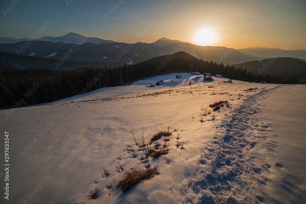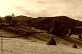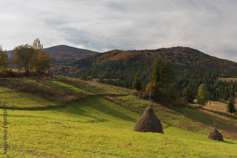 Landscapes on an autumn mountain village, with beautiful houses and golden trees around, located in the Ukrainian Carpathians.