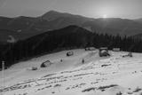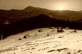 Beautiful winter landscapes from the Ukrainian Carpathian Mountains with traumatic skies and tourists, traveling on ridges