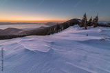 Beautiful winter landscapes from the Ukrainian Carpathian Mountains with traumatic skies and tourists, traveling on ridges