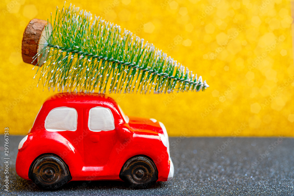 Red toy car carries a Christmas tree for the holiday.