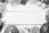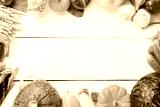 Assorted raw organic fresh vegetables on white wooden table. Fresh garden vegetarian food. Autumn seasonal image of farmer table with mushrooms, rye, cucumbers, tomatoes and eggplant. Free space.