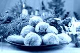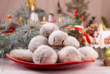 Traditional Christmas almond chocolate snowballs cookies biscuits covered icing sugar powder. Russian Tea Cakes, Mexican Wedding Cookies, Butterballs. Christmas New Year festive ornament decorations.