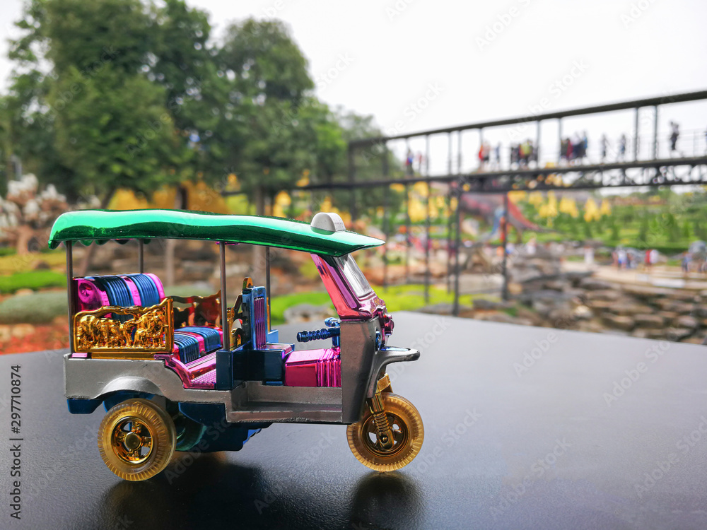 Souvenir mini tuk tuk on Black surface table or road and blur park for background. Thai traditional taxi in Bangkok Thailand.