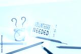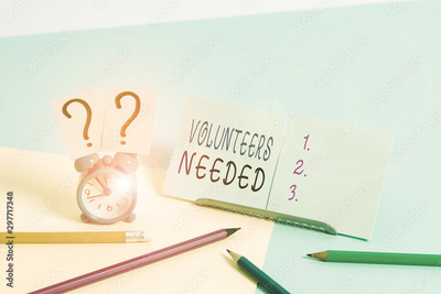 Writing note showing Volunteers Needed. Business concept for need work or help for organization without being paid Mini size alarm clock beside stationary on pastel backdrop