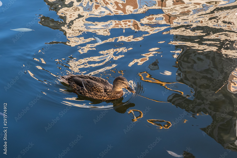 Wild duck floats on the river. Reflect home in water creating a fancy abstract background.