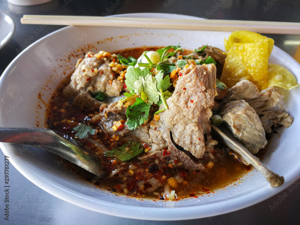 Hot and Sour soup Pork Bone Yellow Noodle in white cup. Use chopsticks and a spoon for eatting.