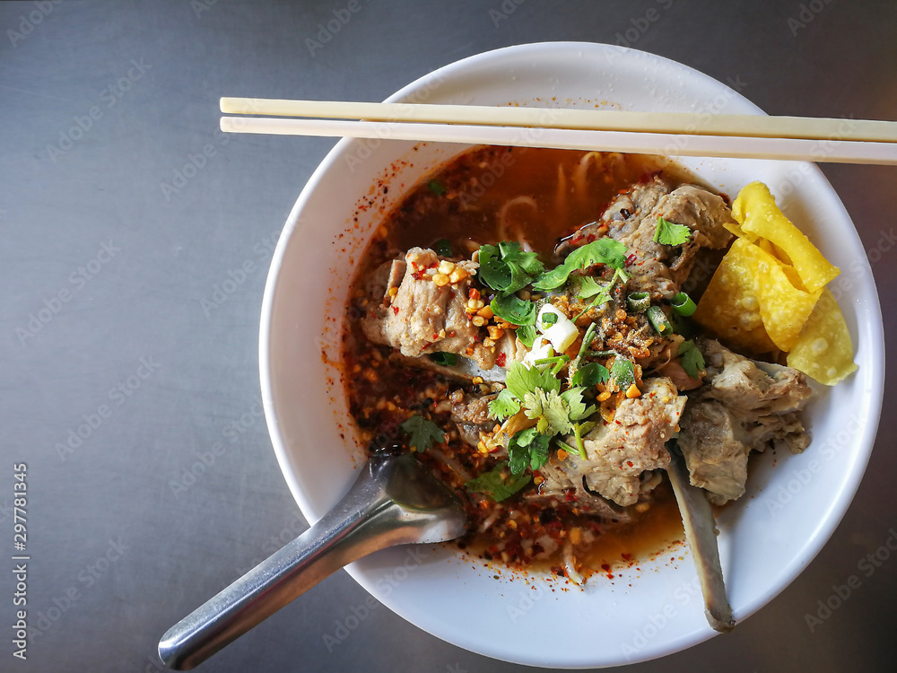 Hot and Sour soup Pork Bone Yellow Noodle in white cup. Use chopsticks and a spoon for eatting.