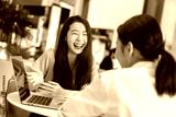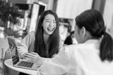 beautiful attractive business female present new project with smile and joyful to client with laptop and modern office background