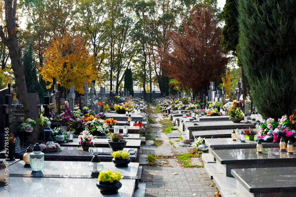 Christian graveyard in autumn. Tombstones decorated with flowers and grave candles. All Saints Day.