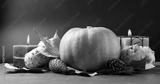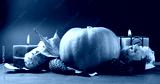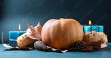 Pumpkin on blue background with candles and autumn leaves and pine cones - image