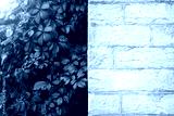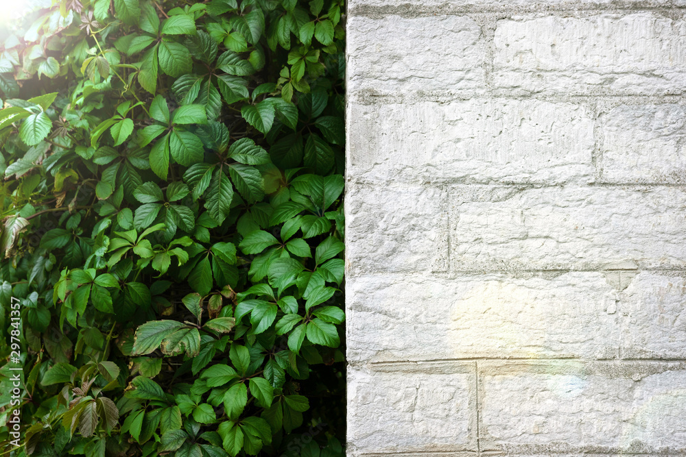 White brick wall and green foliage with sunshine and sunbeams background. Summer background. Close up