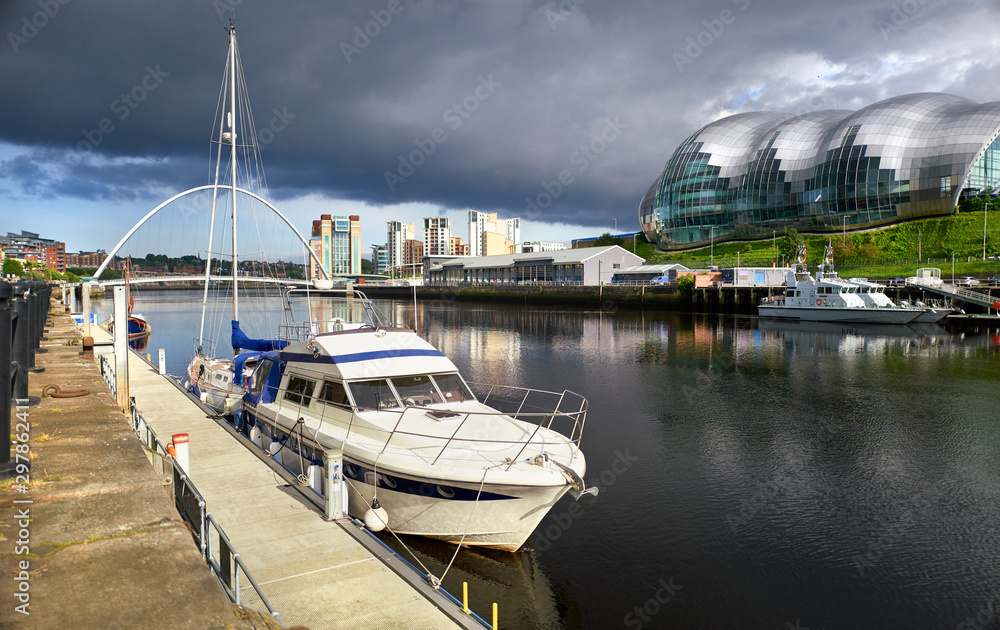 A closeup of a yacht moored at Newcastle's Quayside on the river Tyne with the Baltic Art Museum, Gateshead Sage and Millennium Bridge in the distance.