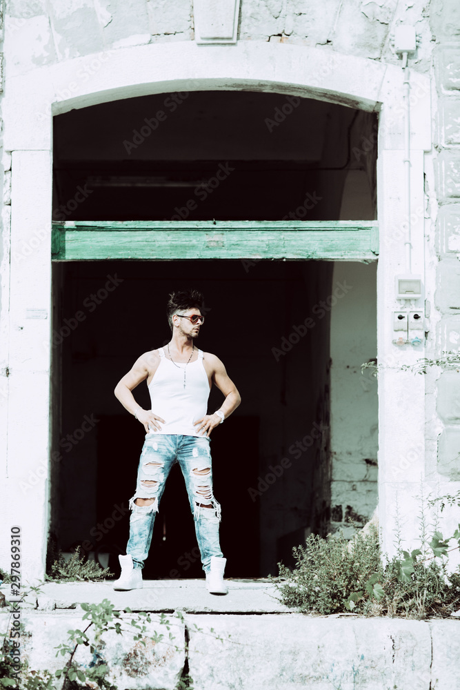 Portrait of handsome man in casual clothing posing in abandoned place, looking away to a side. Color Toned Image. Concept urban man.