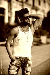 Portrait of handsome man in casual clothing posing on the street, looking away to a side. Color Toned Image. Concept urban man.