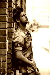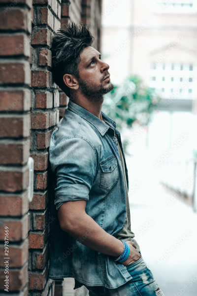 Portrait of handsome man leaning on brick wall, looking away to a side. Toned Image. Concept macho fashion city urban man.