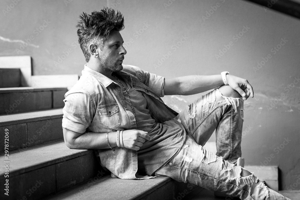 Portrait of handsome man in casual clothing posing sitting on the stone stairs, looking away to a side. Color Toned Image. Concept urban man.