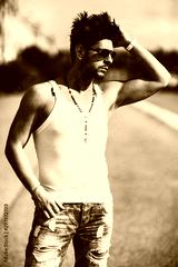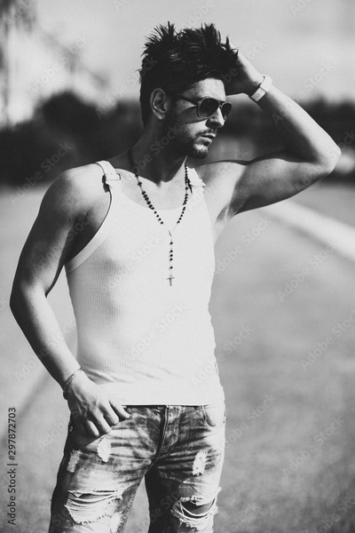 Portrait of handsome man in casual clothing posing on the street, looking away to a side. Color Toned Image. Concept urban man.